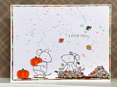 I was behind as always.  I actually turned in last month's card early and I just knew I would forget about the month of September.  It was a self fulfilling prophecy.  I pulled out an old faithful from My Favorite Things and decided I was going to color only some elements of the images I stamped.  And of course I had to add some splatter.  I found some fall plaid card stock from Lawn Fawn and used it to mat my card front.  These mice are so cute and I just love fall weather.  Starbucks and Dunkin have Pumpkin Spice flavored coffee - yum!  And it is getting dark earlier.  I am looking forward to wearing blue jeans and sweatshirt and socks.  LOL. So here you go - September's card.